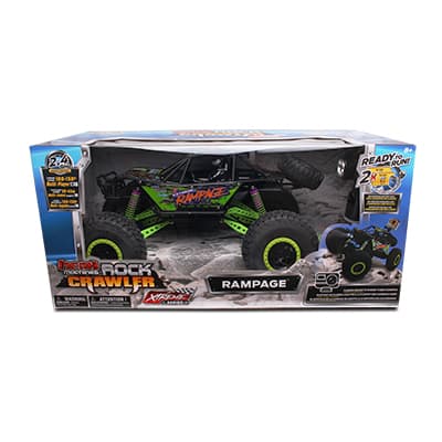 The brand new Ready To Run 2.4GHz 1/10 scale Rampage Rock Crawler with Action Camera Mount features an innovative suspension system that allows for unparalleled rock crawling abilities! The motors are incredibly powerful and the tires are insanely grippy, yet the proportions of chassis to body are natural and beautiful. With a super rugged body, this rock crawler is ready to climb! Features headlights and an action camera mount.Specifications