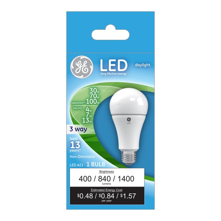 GE Soft White LED light bulbs offer outstanding energy efficiency, long-lasting performance and just-right brightness, all in one package. They illuminate your home with a crisp, bright white light. Use this bulb in fixtures rates for 3way bulbs.Specifications