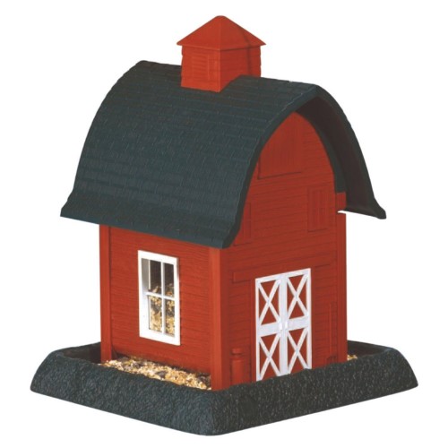The Red Barn birdfeeder is part of an extensive Village Collection of feeders. This feeder is reminiscent of a country red barn with white accents and a green roof. Measuring 10.25 x 9.5 x 13.25 inches high this feeder has the capacity to hold 5 lbs. of seed. For monitoring seed levels its windows are framed with clear plastic panes. The roof contains a lift-off cupola to make filling this feeder a breeze. The large tray/perch is removable for easy clean out. This versatile feeder can either be used as a hanging birdfeeder or pole mounted and offers a three year warranty. Made from durable molded plastic this feeder will last for years to come.Specifications