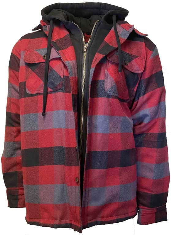 BRAWNY FLANNEL SHELL; CHEST POCKET; HOODED; LOWER ON SEAM POCKETS; POLY FILL QUILT LINED