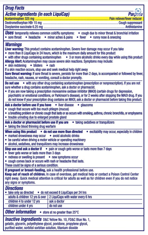 EFFECTIVE NIGHTTIME COLD & FLU SYMPTOM RELIEF. NyQuil Cold & Flu LiquiCaps temporarily relieves common cold & flu symptoms so you can get the rest you need; FAST RELIEF SO YOU CAN SLEEP. Don't let your cold keep you up. Just one dose of NyQuil starts working fast to provide effective cold & flu relief; FAST, POWERFUL MULTI-SYMPTOM RELIEF for your headache, fever, sore throat, minor aches and pains, sneezing, runny nose, and cough.; POWER THROUGH YOUR WORST COLD & FLU SYMPTOMS. Life doesn’t stop when you have a cold. NyQuil relieves bothersome symptoms such as cough and fever so that you can get the rest you need; WORLD'S #1 SELLING OTC COUGH AND COLD BRAND. Vicks has been trusted for over 125 years to relieve your worst cold & flu symptoms.