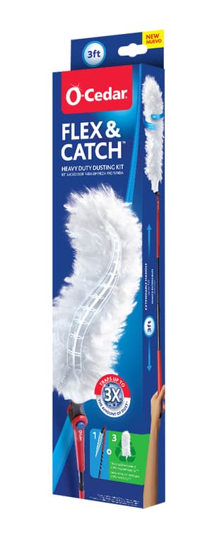 Dust, meet your match with O-Cedar's Flex & Catch. The Flex & Catch Heavy Duty Dusting Kit offers unmatched dust pickup, capturing up to 3X more dust than traditional dusters, leaving your surfaces impeccably clean. Its versatile 3-foot handle extends to dust hard-to-reach areas such as high ceilings, vents, mirrors, and tight spaces between bookshelves. The patented flexible head maneuvers around objects with ease. Upgrade to the Flex & Catch Starter Kit which includes 3 Duster Refills.Specifications