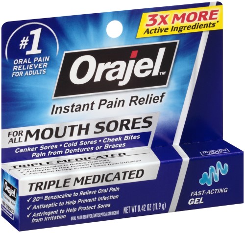 ORAJEL for ALL MOUTH SORES expires SORES canker cold cheek bites pain from dentures or braces 20 benzocaine to relieve oral antiseptic help prevent infection astringent protect irritationSpecifications
