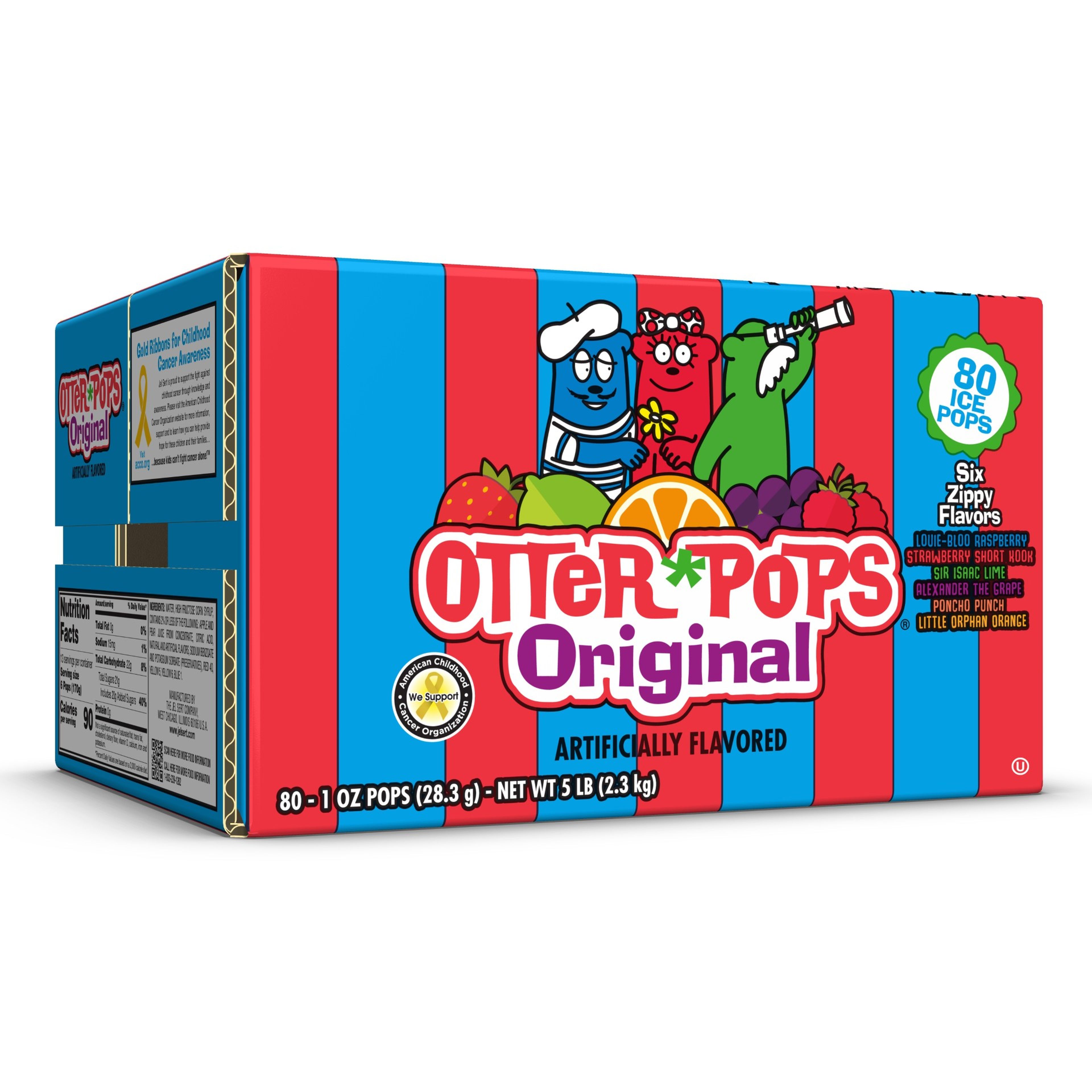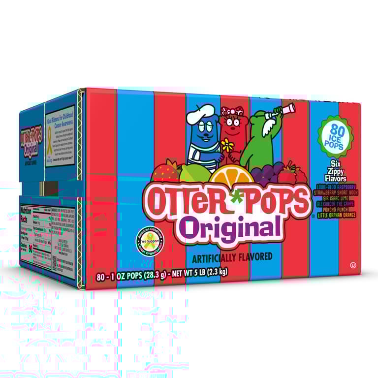 Keep your freezer full all summer long with your favorite ice pops! Otter Pops Assorted 80 -count has all of the original Otter Pop flavors including Lil’ Orphan Orange, Sir Isaac Lime, Poncho Punch, Louie Bloo Raspberry, Strawberry Short Kook and Alexander the Grape! The perfect summertime treat.Specifications