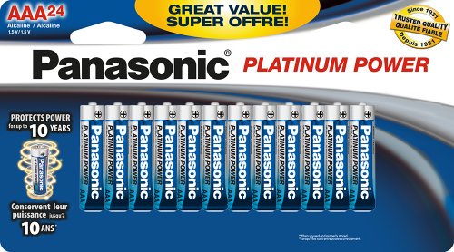 Power all your devices with Panasonic Platinum Power alkaline batteries. Platinum Power AA and AAA alkaline batteries are 33% longer lasting AA AAA C and D size protect power for up to 10 years and 9V up to 5 years when unused and stored properly. These battery cells are formulated to provide peak performance for todays power hungry devices such as radio controlled toys and game controllers. Platinum Power batteries are the perfect choice for all products that require long lasting battery life. They can also be used in everyday medium and low drain devices such as flashlights remote controls and thousands of other products. Platinum Power Alkaline batteries cells are engineered by Panasonic a trusted industry leader in battery technology since 1931. Panasonic Platinum Power alkaline batteries deliver the power your devices demand at a price you can afford.Specifications