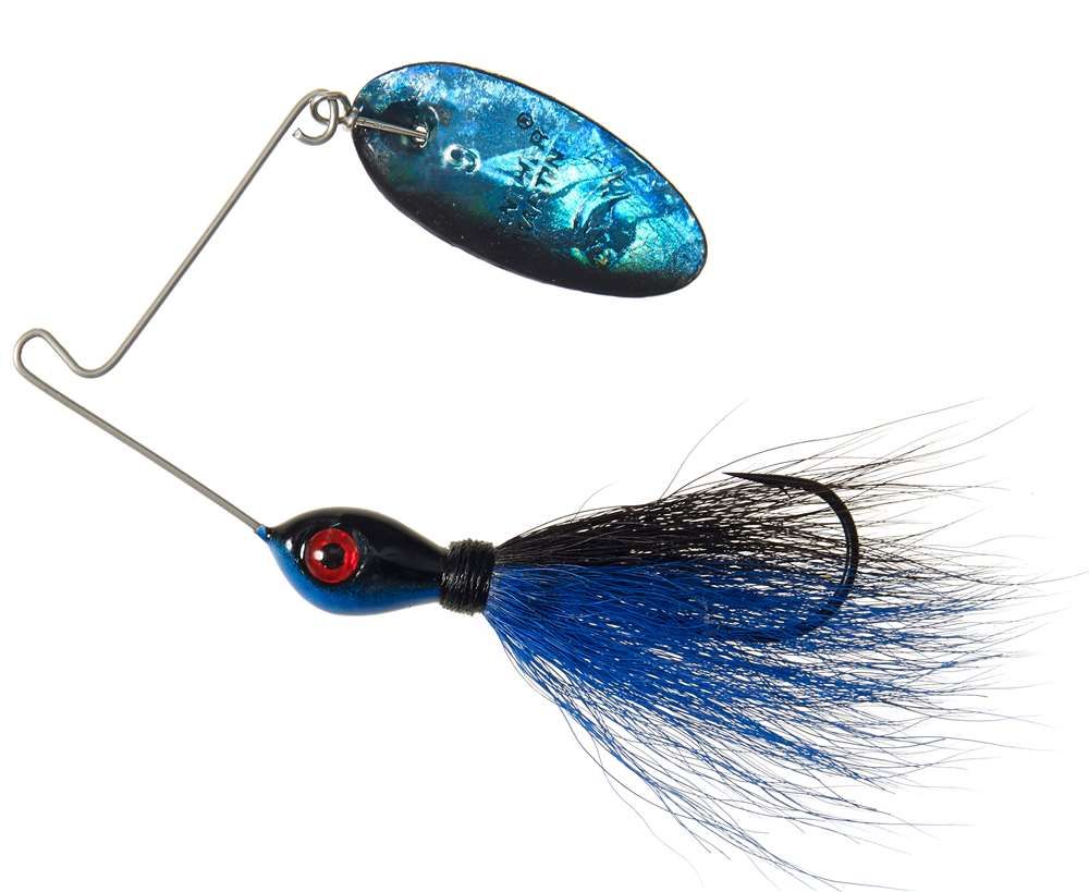 Free Floating Sonic Arm with bearing bead and creates extra vibration; hand-tied bucktail jighead body; lure will helicopter down into a free fall; Mustad Black Nickel Opti-Angle Needle Point, Round Bend hook; Specifically designed to catch Large and Smallmouth Bass, but works great for Pike, Walleye and Panfish; Spinner Bait w/ Bucktail Holographic Blade, #9, 1/4oz, Blue Black Holographic