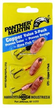 Here are 3 new copper blade Panther Martin's with classic style colors and bodies. Our all copper Panther Martin has a copper blade, with an oversize big belly barrel shaped body. This is to give this model the same weight and castability as our classic teardrop bodies. Unique shaft through blade design creates easiest and fastest spinning action in the world. Convex/Concave blades send out sonic vibrations that are irresistable to fish.Specifications