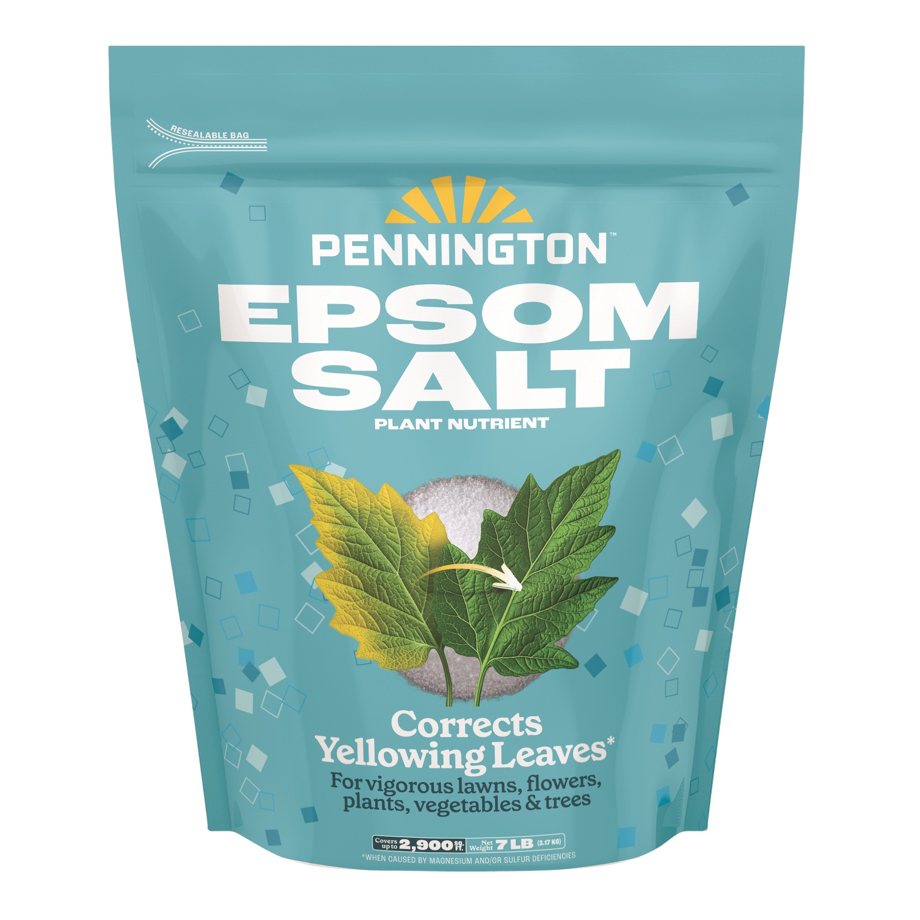 Pennington Epsom Salt Plant Food Fertilizer, 7 lb. contains both magnesium and sulfur, which are crucial to plant growth. Pennington Epsom Salt can be used on a variety of plants such as: vegetables, fruits, shrubs, trees, flowers, and lawns. Epsom salt is very popular among rose growers. It also corrects yellowing leaves when caused by magnesium and/or sulfur deficiencies.Specifications
