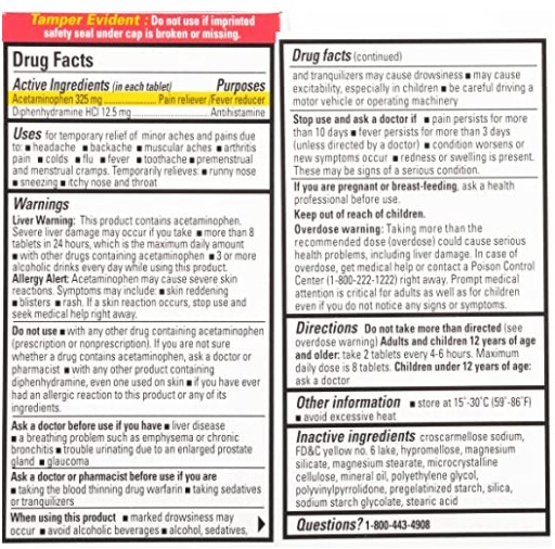 Fast Acting. Acetaminophen/Diphenhydramine. For Enhanced Relief of Pain. Aspirin-Free Pain Reliever. Fever Reducer/Antihistamine. 90 Easy to Swallow Coated Tablets. Uses for temporary relief of minor aches and pains due to: headache, backache, muscular aches, arthritis pain, cols, flu, fever, toothache, premenstrual and menstrual cramps.Specifications