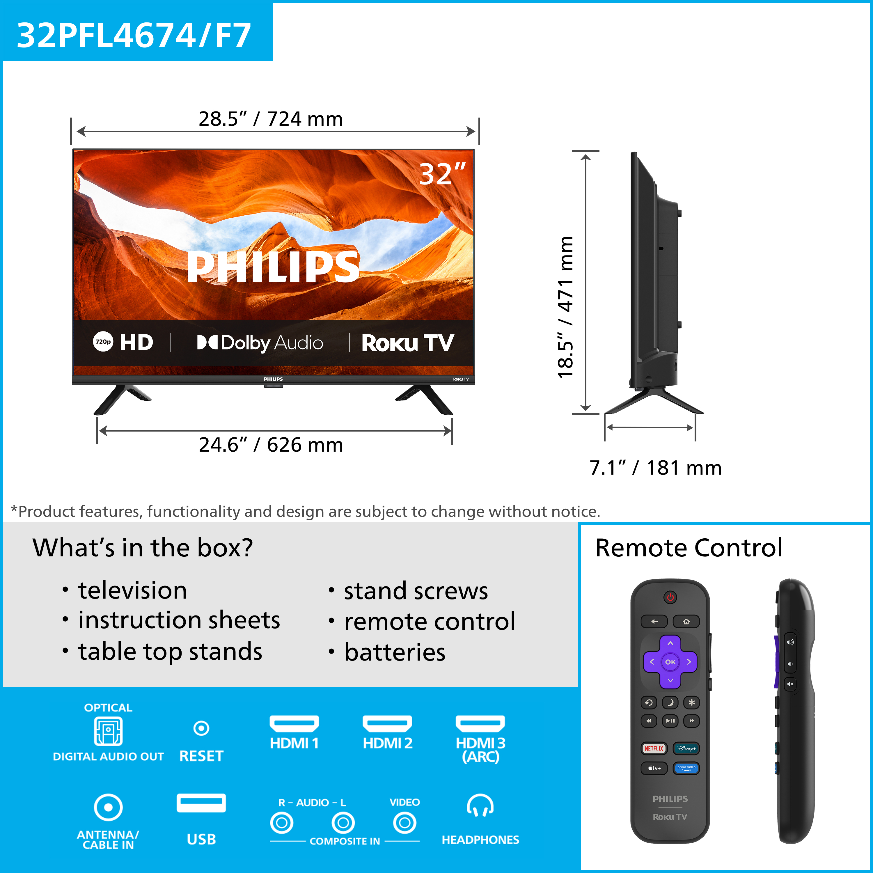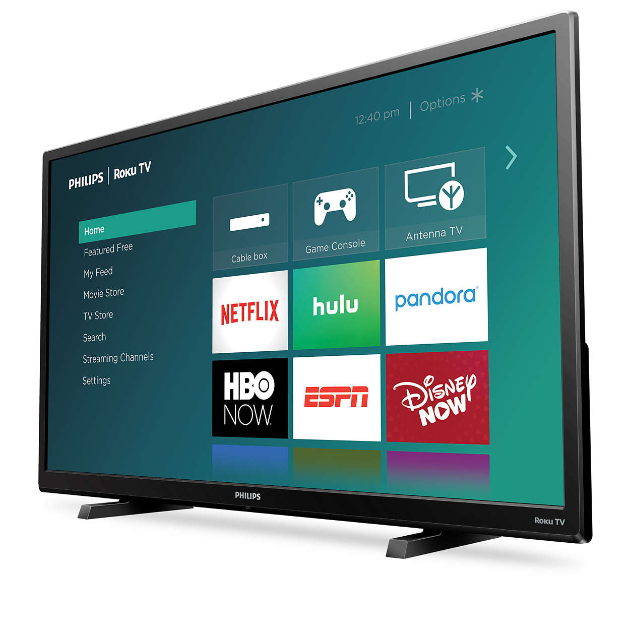 32" Smart Roku TV with Borderless design. Perfect for the Kids room, or the vacation cabin. Has Hi Definition 720P Picture quality, with Dolby audio and 16 watts of stereo power driven into two spaekers. Cinema settings , movie ,zoom and standard audio presets. Clock; sleep timer; child protection using parental mode; Picture presets for Standard,Soft,or Dynamic user;digital noise reduction;picture enhancement and color temperature adjustments make this a winner for all uses;comes with remote,batteries;stand and easy setup guideSpecifications