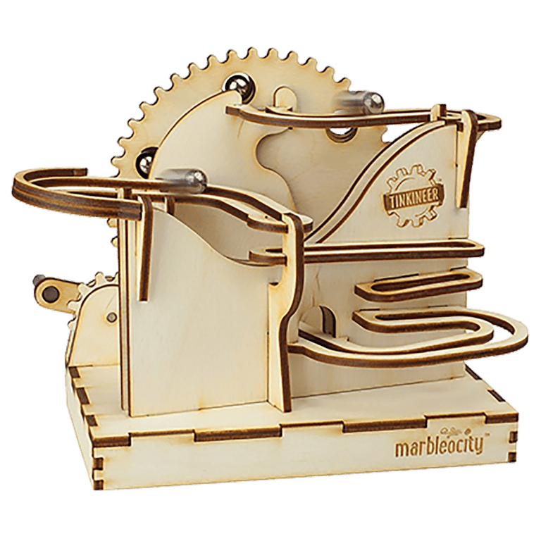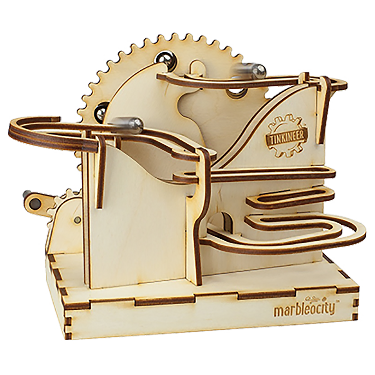 Tinkineer’s Marbleocity introduces children to engineering principles and physics concepts with dynamic hands-on STEM model kits made of precision-cut wood in the USA. Each kit includes easy-to-follow assembly instructions in a graphic novel that features the Tinkineer characters. The comic introduces a physics concept or engineering mechanism that is the focal point of the model, all in a fun and engaging way. 30 peices.Specifications