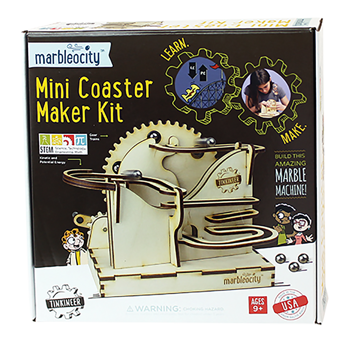Build your own working roller coaster model made of real wood! The Mini Coaster is full of dips and turns with some engineering and physics thrown inso once you build your coaster you can run marbles ; The assembly instructions feature a graphic novel with the Tinkineer cast of characters Kelvin Joule Newt and friends to communicate meaningful STEM concepts in an engaging format