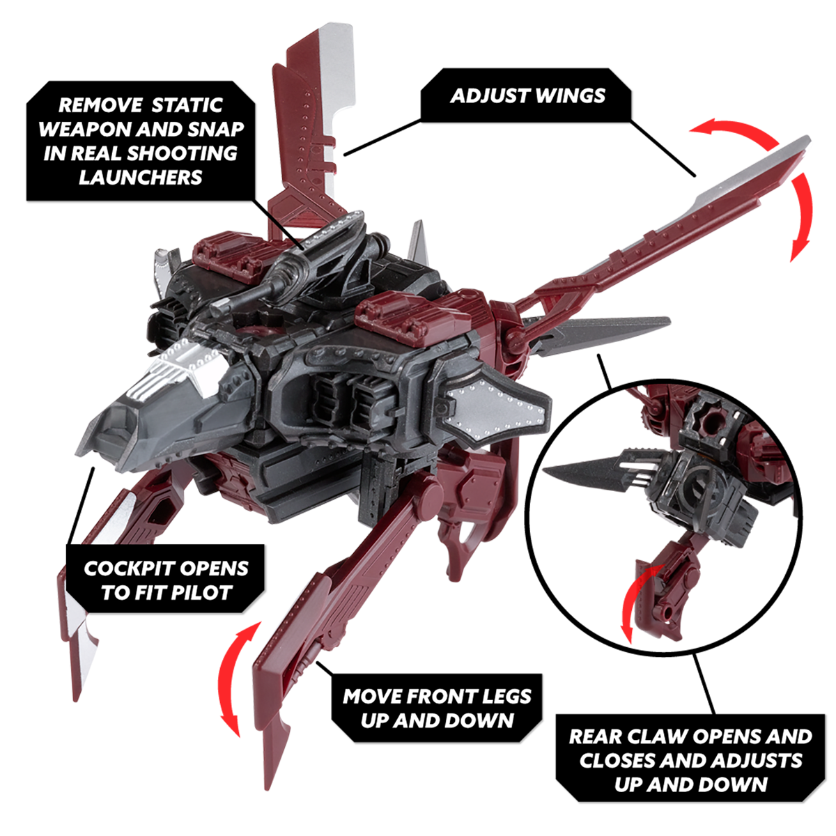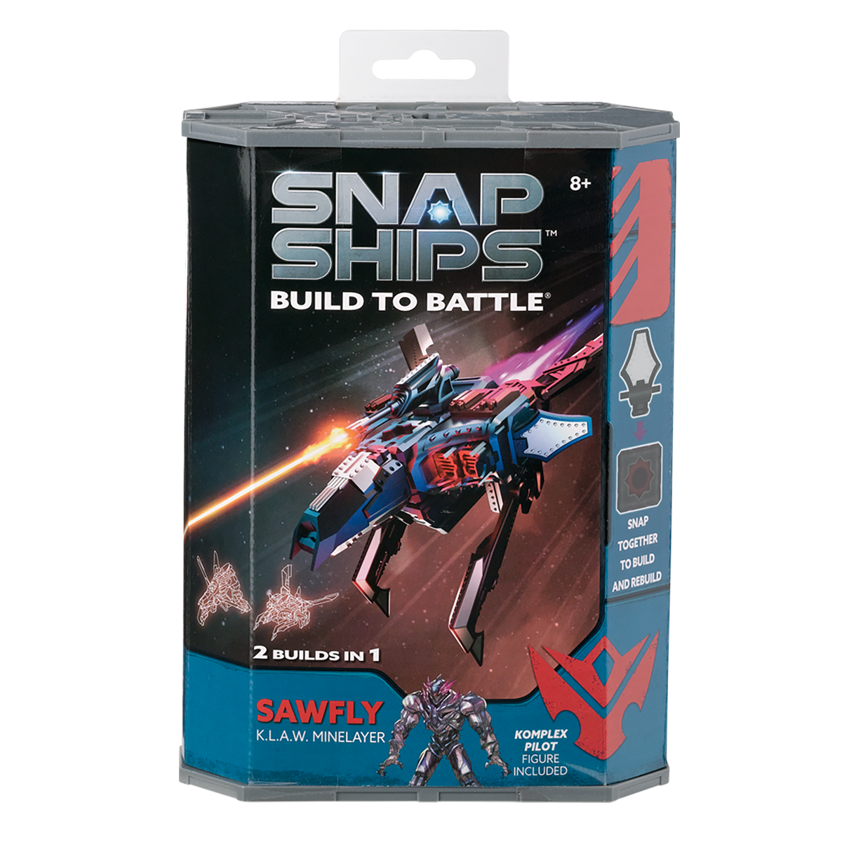 Real shooting action for battle play; Sawfly features a proximity mine poseable armatures to rip apart enemies and a cannon with high-velocity projectiles; Sawfly is the Komplexs attack ship piloted by a Komplex fighter; Snap Ships is a versatile building system for creating multiple crafts with action play and all sets and pieces are interchangeable so kids can build however they want