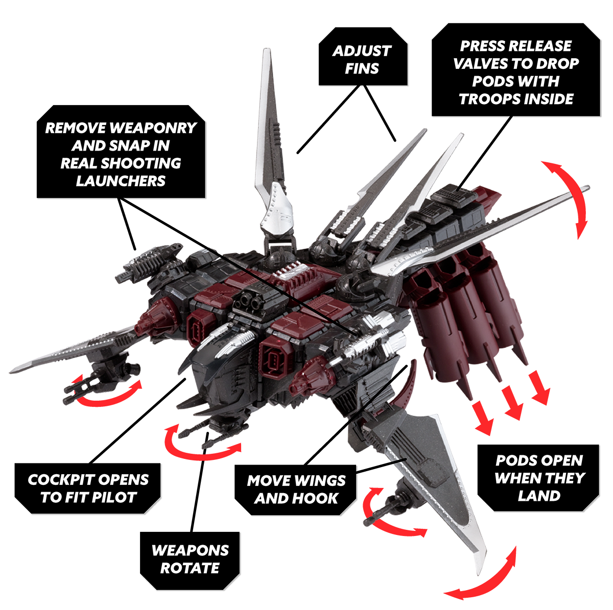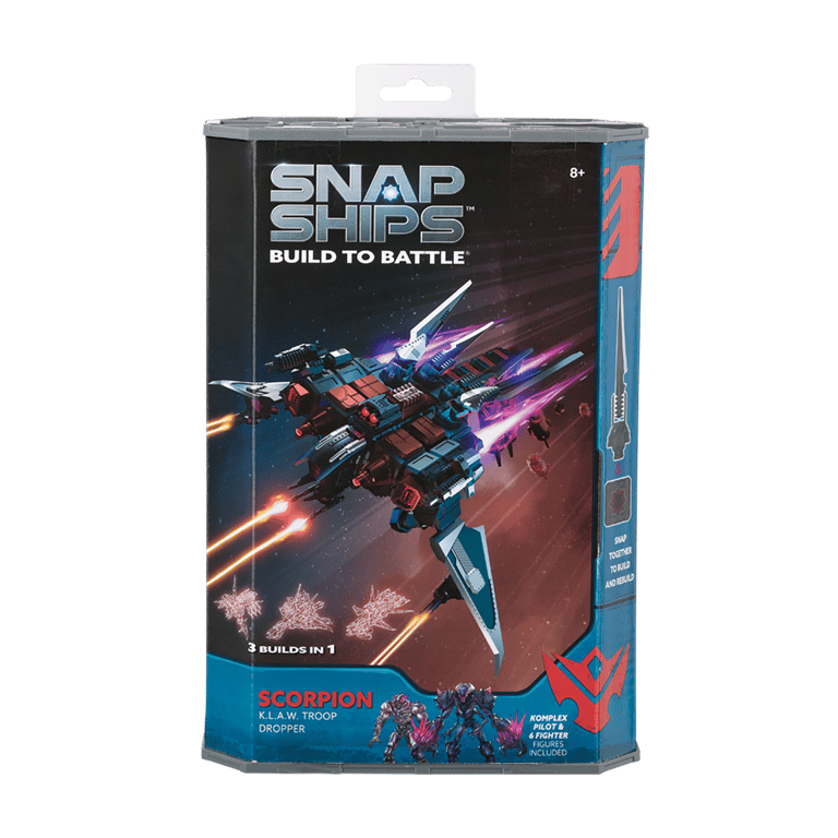 Scorpion features a Troop Pod for shock troop deployment Anti-Matter Cannon for extreme ground attack and a Heavy Boom Weapon with continuous beam; Scorpion K.L.A.W. Troop Dropper is the Komplexs fighter deployment ship piloted by a Komplex fighter; Snap Ships is a versatile building system for creating multiple crafts with action play and all sets and pieces are interchangeable