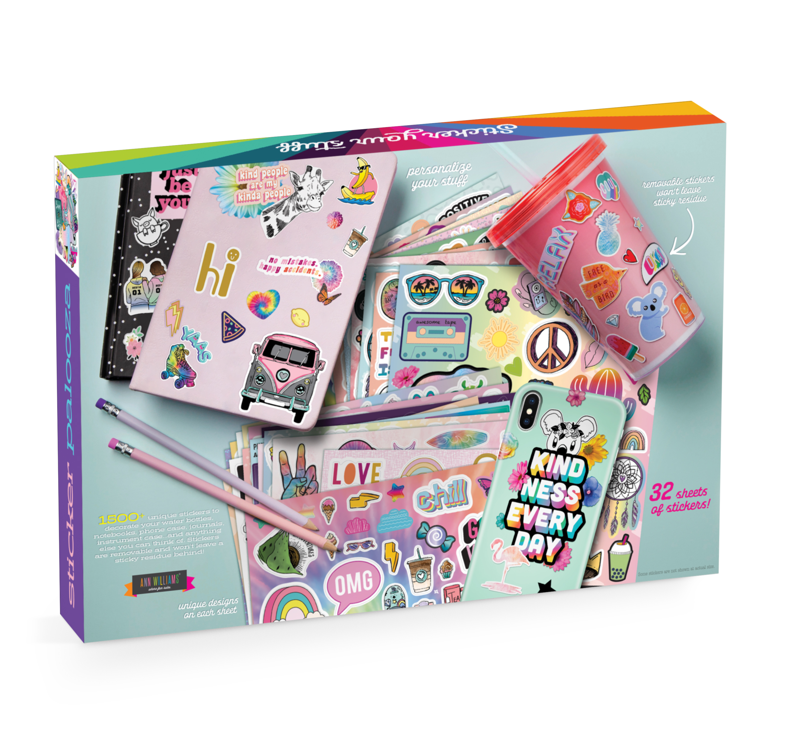 These thick, high-quality stickers are mom-approved because they stick great but are removable with no sticky mess left behind - yay! Personalize your notebook, phone case, instrument case, water bottle, or anything else you can think of with 1500+ fun stickers.Specifications