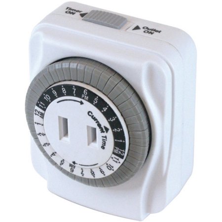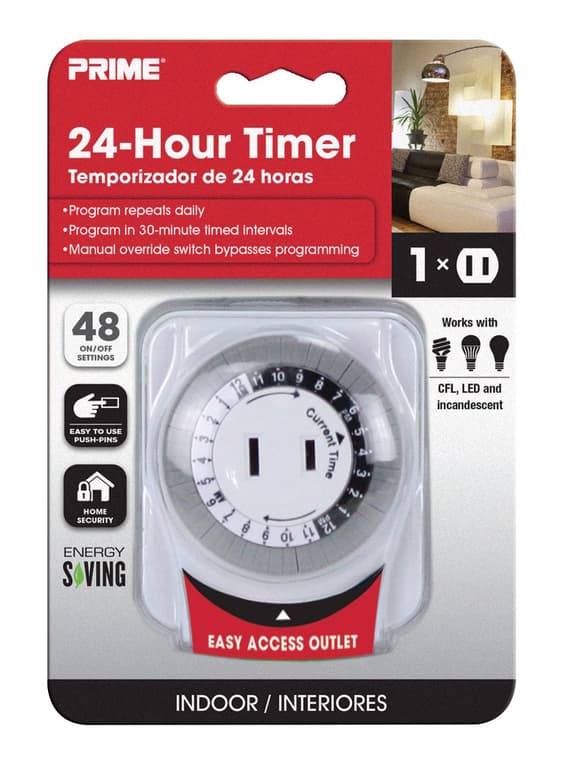 The pass-thru outlet design allows for easy access. A 24-hour repeating cycle allows devices to be turned on and off daily in 30-minute programmable intervals. Designed with push down pins that are extremely easy to operate, this unit also features a manual on/off override switch for convenient one-touch programming bypass.Specifications