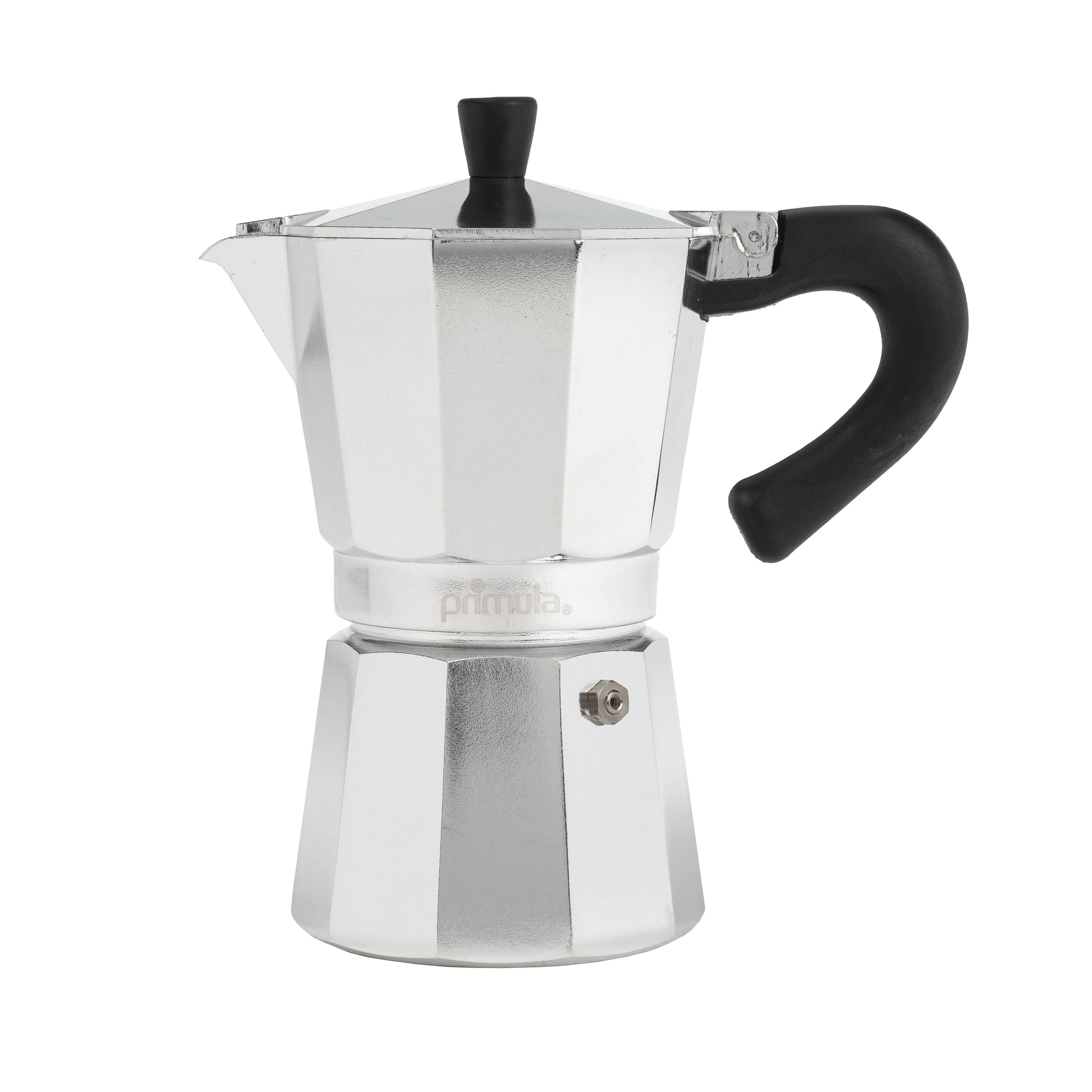 Primula’s Stovetop Espresso Coffee Maker delivers three perfect demitasse servings of rich, authentic espresso or Cuban coffee. Stove top expresso makers are popular because you can make quality espresso quickly, without the hassle of electric espresso machines. Primula’s Stovetop Espresso Maker is compact and easy to use. Its distinctive design provides even heat distribution for enhanced flavor and aroma. Included in each box are easy step-by-step instructions to make the perfect serving of espresso the very first time. Simply fill the lower chamber with water, fill the filter with ground coffee, and place on stovetop. Within minutes, delicious, bubbling espresso will fill the pot. Remove from heat and enjoy! This cast aluminum espresso maker features a safety-release valve, a major factor in controlling the quality of your espresso. It controls the pressure with which the water is delivered to the coffee grounds. This stovetop Cuban coffee and espresso maker allows you to make delicious espresso without worry, as the safety release valve controls the pressure at a set, pre-determined level. This sturdy coffee maker is carefully crafted of strong, long-lasting cast aluminum and features a flip-top lid with a temperature resistant knob and handle that allows for easy, safe pouring.Specifications