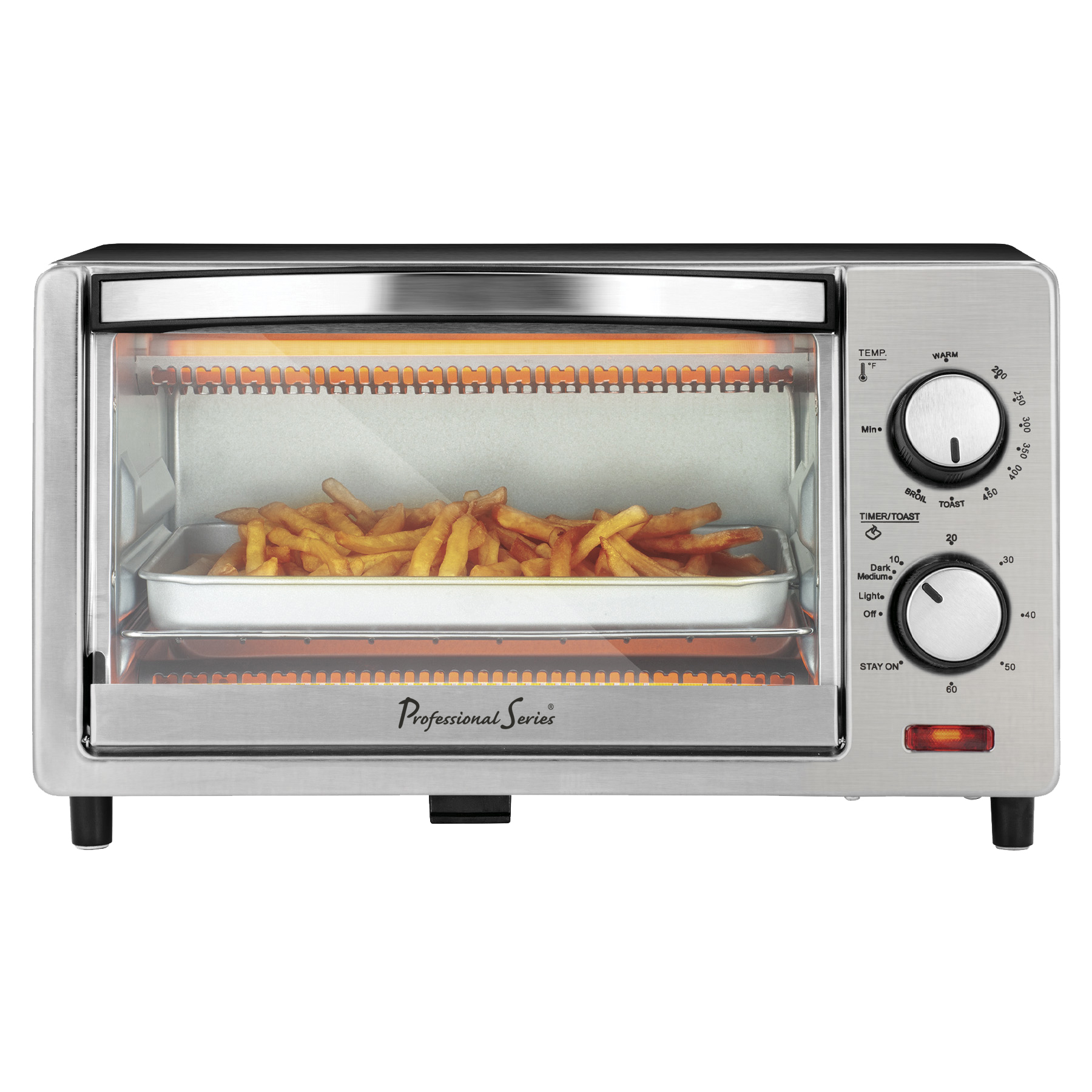 4-slice Toaster Oven; 60 minute timer; Adj. temp.; Backing Pan and rack included; Bake Toast and Broil functions; Crumb tray; Fits 9" Pizza; Professional Series SS; Stainless steel body