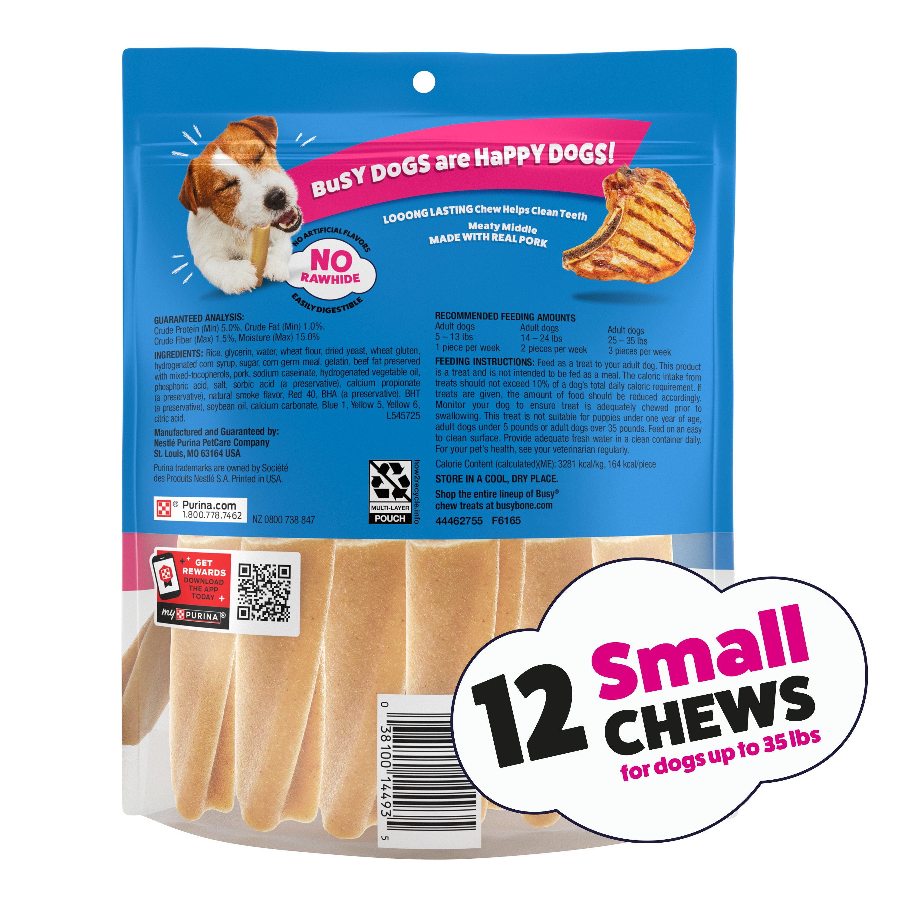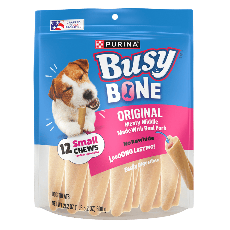 Bring a boost of unexpected and enthralling flavor to your dog's day with Purina Busy Bone mini adult dog chew treats. Delight his taste buds with a reward with real meat found in the center of each of these chew bones while also letting him know how much you appreciate what a good boy he's been. Formulated for mini adult dogs, these Busy Bone treats feature a unique shape that's sure to keep his tail wagging with every twist of adventure they take him on. While he remains engaged by its complex design, the tempting taste of this dog chew provides added fun to chew time. Since they contain no FD and C colors, you can feed these treats without worry. Made without rawhide, this long-lasting treat extends his enjoyment to create an exciting, engaging activity for him that also helps occupy his time, and the rich flavor lets him know you care about his cravings for bold, meaty flavor. These adult dog treats satisfy his need to chew, giving you an easy way to keep him busy when you just can't pull yourself away to play or also when he just needs some "me" time. Your little dog is a big part of your life, so give him the tempting treats he loves, and watch as he flips head over paws while getting lost in his own little Busy world.Specifications