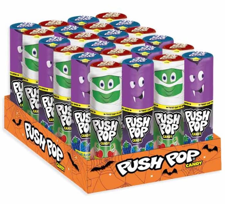 PUSH POP LOLLIPOP HAS SOMETHING FOR EVERYONE. THIS HARD CANDY HAS TWO GREAT TASTING FLAVORS THAT CAN BE RESEALED FOR A SWEET TREAT LATER. THIS IS A GREAT ON THE GO CANDY FOR KIDS OR A FESTIVE AND FUN GIFT FOR TRICK OR TREATERS.Specifications