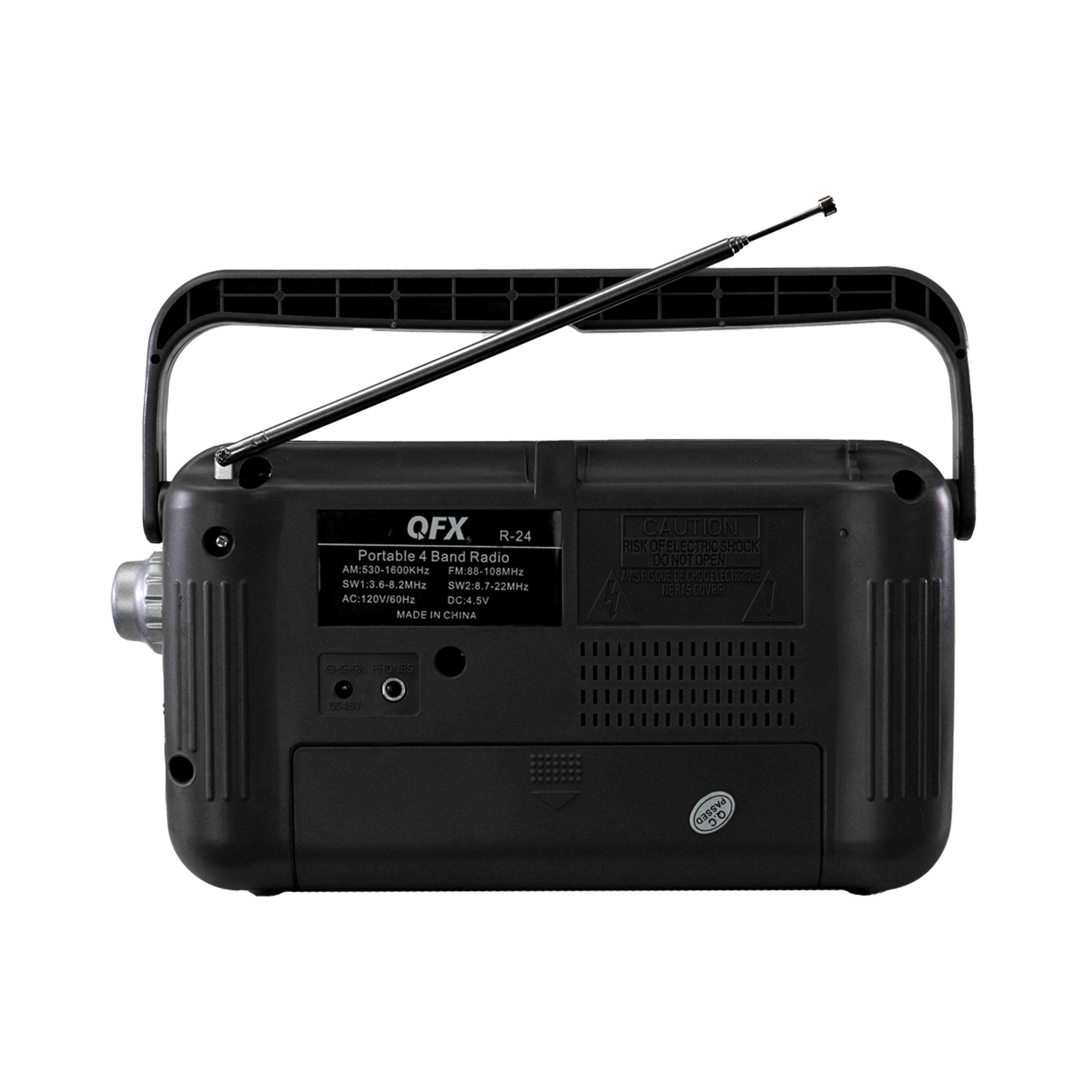 The QFX R-24 is a 4-band AM/FM/SW1/SW2 radio with built-in 2' speaker, telescoping antenna and headphone output jack. Plug in earphones or headphones to enjoy private listening. It operates on AC power or 3 x AA batteries (not included) and has a swivel handle for convenient listening on the go.Specifications