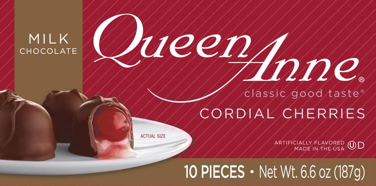 10 CT; 6.6 OZ; Contains Milk, Soy; Enjoying Queen Anne Cordial Cherries is a wonderful family tradition; Flavors of rich milk chocolate and cherry; Our 6.6 oz box makes the perfect add-on gift; Queen Anne is the #1 brand of cordial cherries in the US; Share Queen Anne with your family and friends!