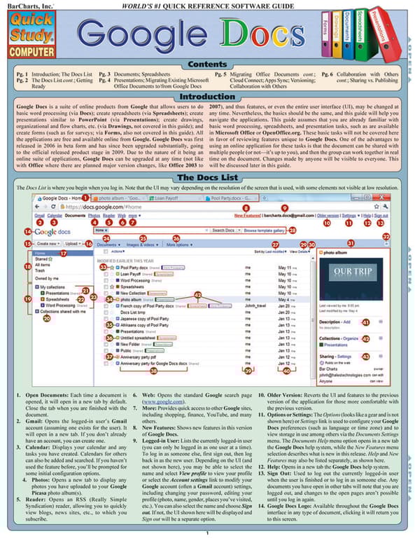 Want to learn more about how GoogleDocs can increase your productivity? Look no further than our new 3-panel guide, which features the latest, most up-to-date information about this powerful suite of online products. Each GoogleDocs application-from word processing to spreadsheets-is examined in detail through step-by-step instructions, key definitions and full-color screen shots. Every GoogleDocs user will want to have this comprehensive reference tool by his or her side!Specifications