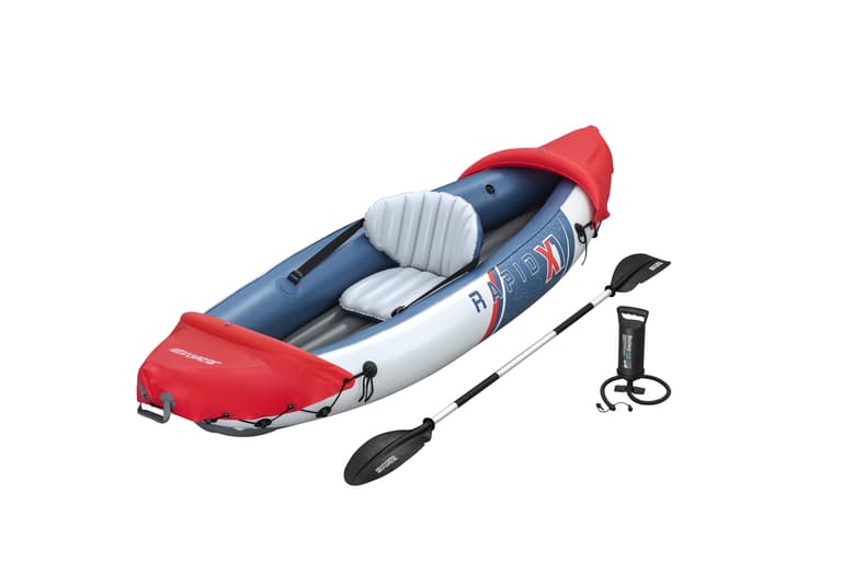The Hydro Force Rapid X1 Kayak set is a must-have for every outdoor enthusiast. This spacious kayak is perfect for one adult with an overall weight capacity of 265 lbs (120 kg), inflates and deflates easily and packs down small, making it possible to bring along on any adventure. Made from our Inflata-Shield material that is designed to resist puncturing and limit stretching for stability and air retention, this kayak is great for use on creeks, small rivers, lakes and more. The cockpit features an adjustable inflatable seat with a cushioned backrest to keep you comfortable on long rides. Plus, two removable fins in different sizes allow for directional support in various water conditions. The form-fitted construction prevents water from getting into the cockpit and soaking you or your gear, but also allows for easy entry and exit. And the two heavy-duty carry handles make transporting the kayak to and from the water a breeze. The Rapid X1 set also includes a carry bag for the kayak, a paddle, pump and fins, so you can travel wherever it is you want to roam.Specifications