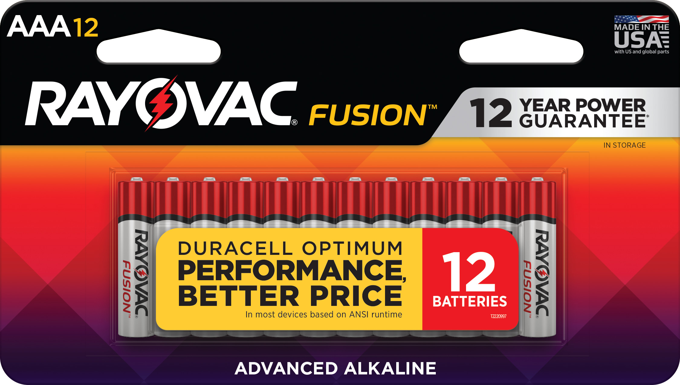 12 Pack; Designed to Prevent Damaging Battery Leaks; Excels in High-Powered AAA Battery Devices; Hold Power Up to 12 Years in Storage; Made in the USA; No AAA Alkaline Battery Lasts Longer on ANSI Average Performance Tests; Premium Alkaline AAA Batteries; Tested Twice