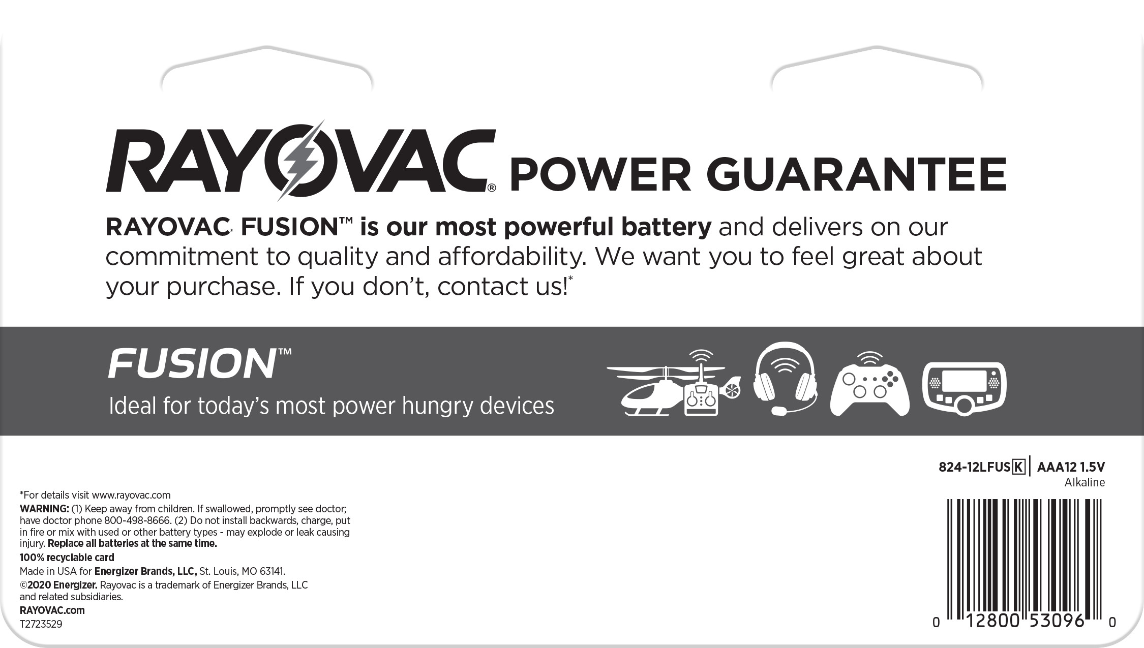 The most powerful alkaline battery from the #1 value brand in the world, RAYOVACFUSION AAA batteries deliver maximum performance in today’s most power hungry devices. Designed to prevent damaging leaks and tested twice prior to shipment to ensure reliability. Ideal for today’s high drain devices, including high-powered toys, video game controllers, wireless headsets and remote-control aircrafts, and more.Specifications