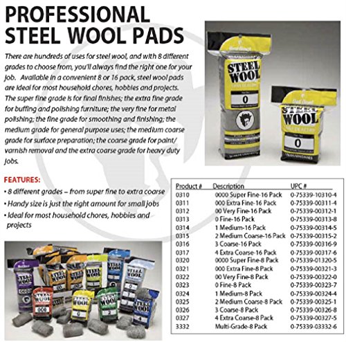 There are hundreds of uses for steel wool, and with 8 different grades to choose from, you'll always find the right one for your job. Available in a convenient 8 pack, steel wool pads are ideal for most household chores, hobbies and projects. The super fine grade is for final finishes; the extra fine grade for buffing and polishing furniture; the very fine for metal polishing; the fine grade for smoothing and finishing; the medium grade for general purpose uses; the medium coarse grade for surface preparation; the coarse grade for paint/varnish removal and the extra coarse grade for heavy duty jobs.Specifications