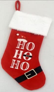 20" Stocking with white plush trim, Ho Ho Ho wording and a Santa belt on the toeSpecifications