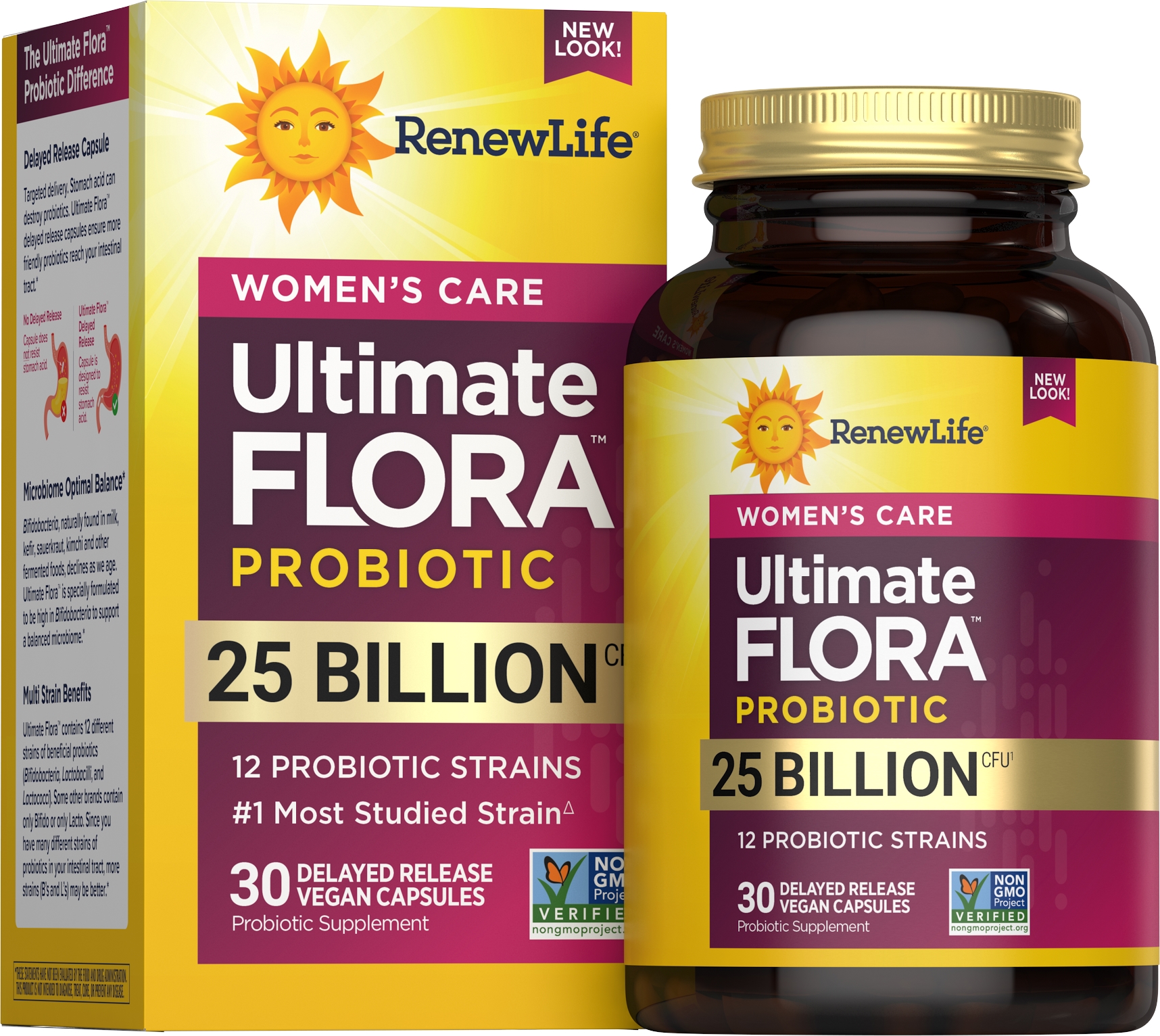 Renew Life Ultimate Flora Women’s Care Probiotic has 25 billion live cultures from 12 probiotic strains to support urinary, digestive and immune health, and healthy vaginal pH and yeast levels. It has more strains with clinical trials on women than the strain in the leading brand, and has strains backed by 25 years of women’s clinical research.WOMEN'S PROBIOTIC: Includes one 60-count bottle of Renew Life Women's Care Probiotic Capsules 25 Billion CFU for vaginal, urinary, digestive and immune support (1)CLINICALLY TESTED STRAINS: Women's health probiotic supplement with a blend of 12 different strains to support vaginal, urinary, immune and digestive healthDIVERSE FORMULA: Daily probiotic pills with more clinically studied strains than the leading brand (2) to provide science-backed benefits12 DIVERSE STRAINS: Renew Life womens probiotic contains 12 diverse strains, including the No. 1 most studied strain, the L. rhamnosus GG - for gut health and healthy immune response (3)MULTIPLE BENEFITS: Womens health probiotic helps maintain healthy vaginal bacteria and yeast levels, and supports digestive, urinary and immune healthTESTED AND FORMULATED: Includes 25 billion cultures and world-class strains that are clinically tested and formulated by microbiologists and researchersTOP-QUALITY: These easy-to-swallow, delayed-release pills help ensure the probiotics reach your gut alive and guarantee potency, quality and purity through the expiration date(1) These statements have not been evaluated by the Food and Drug Administration. This product is not intended to diagnose, treat, cure or prevent any disease. (2) Based on IRI unit sales data, January 2021. (3) L. rhamnosus GG strain, PubMed Clinical Trials, August 2019.Specifications