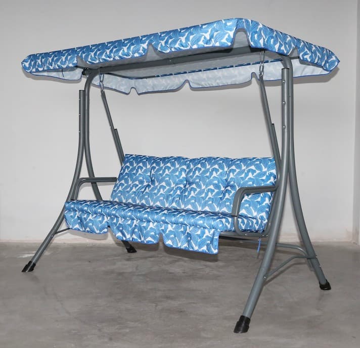 Polyester Padded 3 Seat Cushion w Fringe in Blue Leaf Pattern; Matching Polyester Canopy CoverSpecifications