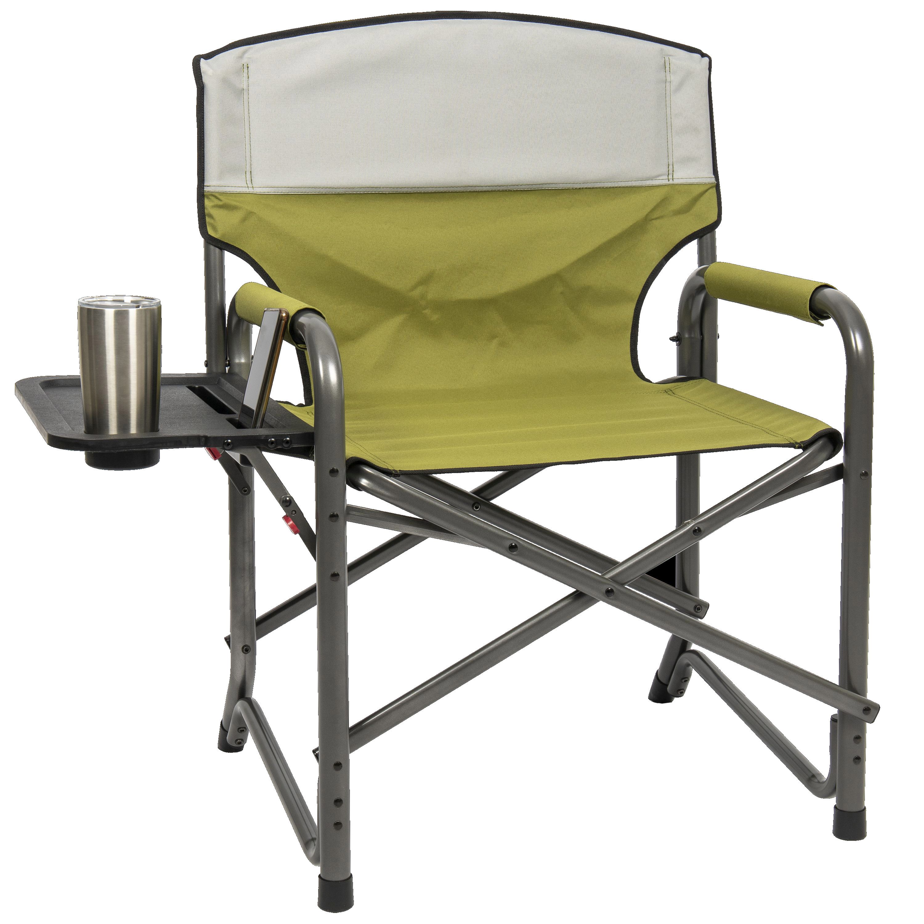 The Broadback XXL Camping Chair is wider and taller than other camp chairs and has a weight capacity of 400 lbs. Perfect for camping or tailgating with friends. This oversized powder coated steel director's chair comes with padded foam armrests, an easy to clean shelf with drink holder, tablet slot, and cell phone slot. Folds compactly for easy transport and storage. Full featured directors chair with retractable side table.Extra oversized powder coated steel frameFold out table with media and drink slotsPadded foam arm restsCarry straps for comfortable trnsportFolds flat for easy transport and storageSeat height 18 inchesWeight Capacity: 400 lbs.Specifications