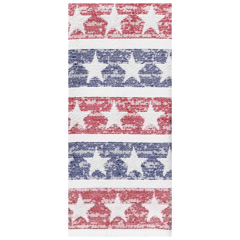Add patriotic charm to your kitchen with the RITZ Stars Jacquard Towel; Woven from 100% cotton, this 16" x 26" towel features a flat jacquard weave for quick drying and stylish displayperfect for everyday tasks or festive gatherings.