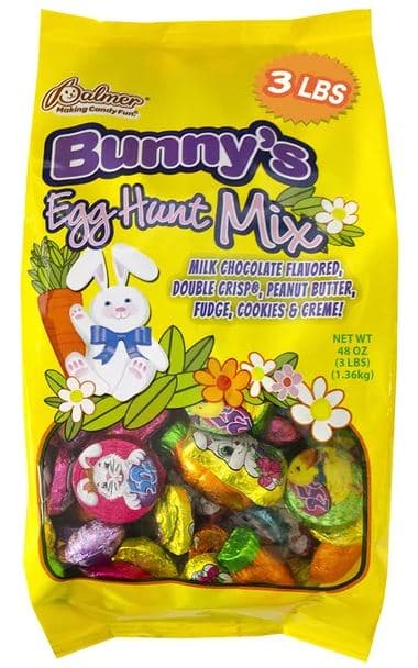 3 LBS; BUNNYS EGG HUNT MIX; EASTER CHARACTER COLORED FOIL PACKAGING; FLAVORS INCLUDE MILK CHOCOLATE DOUBLE CRISP PEANUT BUTTER FUDGE AND COOKIES AND CREME