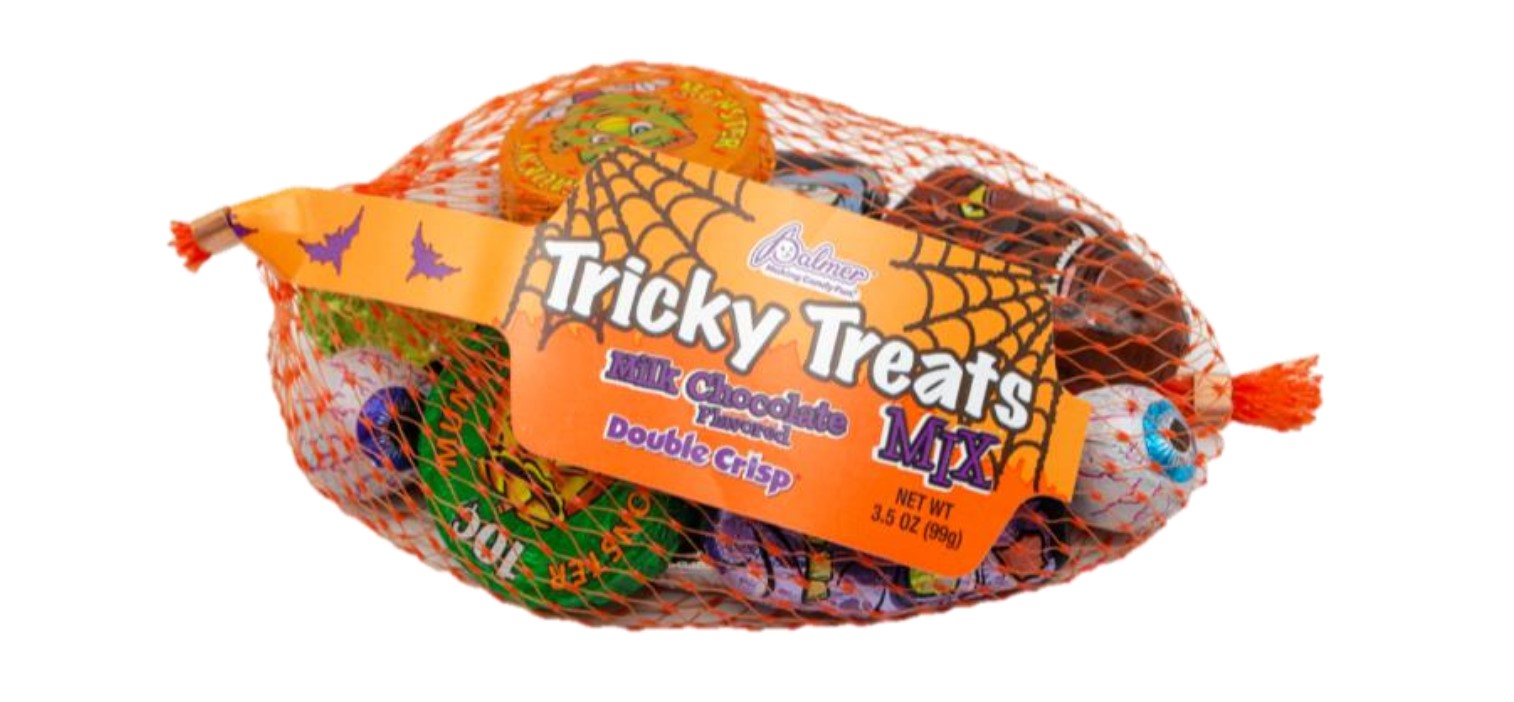 RM PALMER MESH TRICKY TREATS IS A 3.5 OZ BAG OF MILK CHOCOLATE DOUBLE CRISP CANDY THAT IS DECORATED IN FUN HALLOWEEN FOILS. THESE ARE PERFECT FOR A FUN HALLOWEEN SNACK OR HANDING OUT TO TRICK OR TREATERS.Specifications