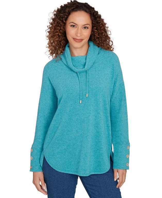 A COZY SWEATER THAT OFFERS KNIT FABRICATION, COWL NECKLINE, LONG SLEEVES WITH BUTTON ADORNMENT AND HEATHERED COLOR STYLINGSpecifications