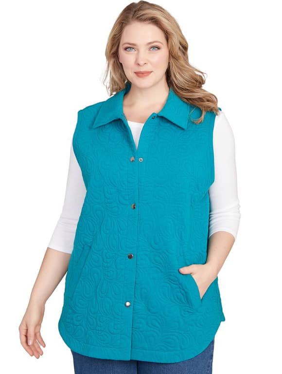 A STYLISH VEST THAT IS SOFT TO THE TOCH WITH ITS FRENCH TERRY FABRICATION, OFFERING A QUILTED DESIGN AND LINED WITH AN OVERLAY BIAS PLAID PRINT. A PERFECT PAIRING WITH THE MATCHING PLAIDI PRINT TOPSpecifications