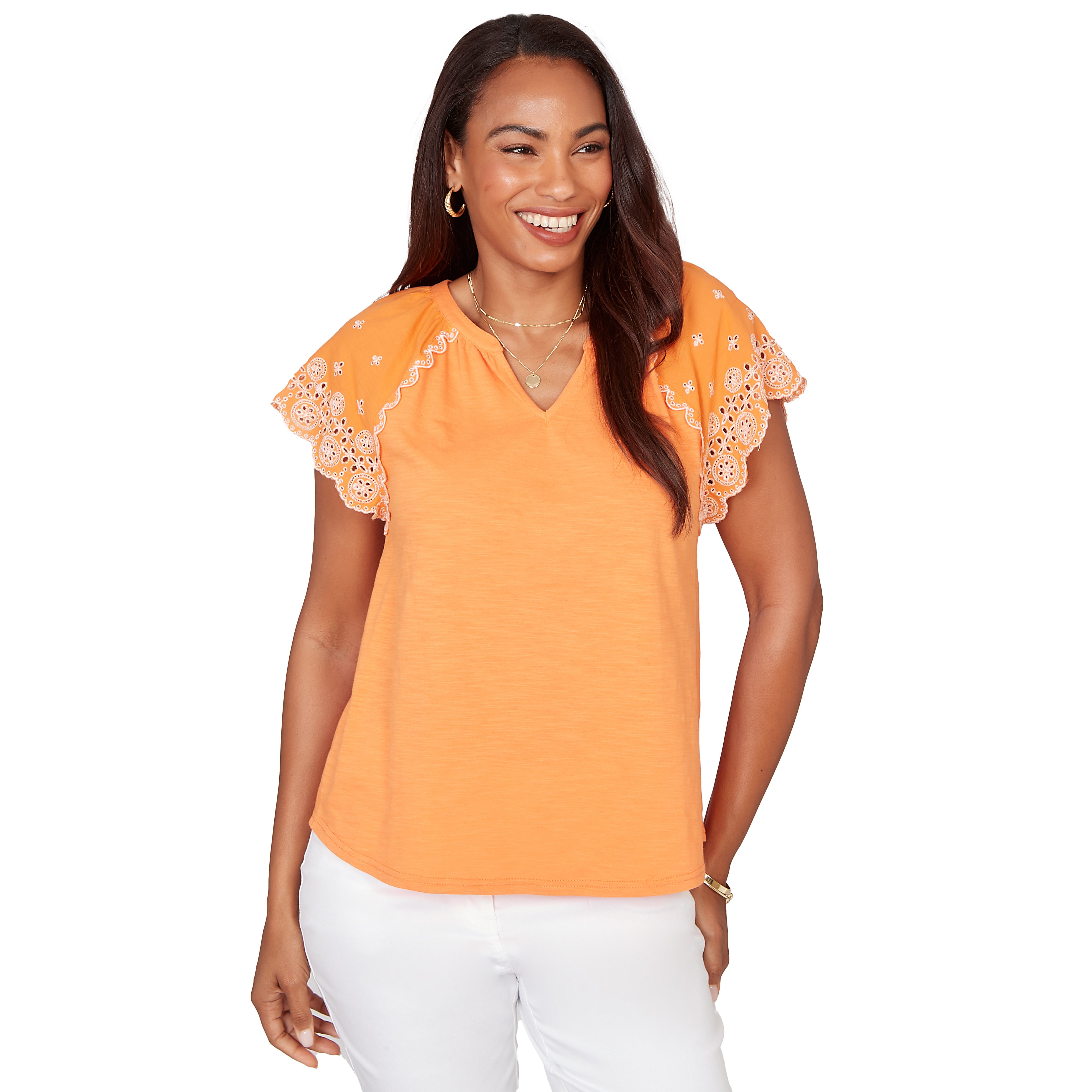 THIS RUBY ROAD WOMEN'S SHORT SLEEVE TOP FEATURES A VIBRANT POP OF COLOR, WITH EYE-CATCHING EMBROIDERY ON THE SLEEVES. PERFECT FOR PAIRING WITH YOUR FAVORITE SHORTS OR CAPRIS.Specifications