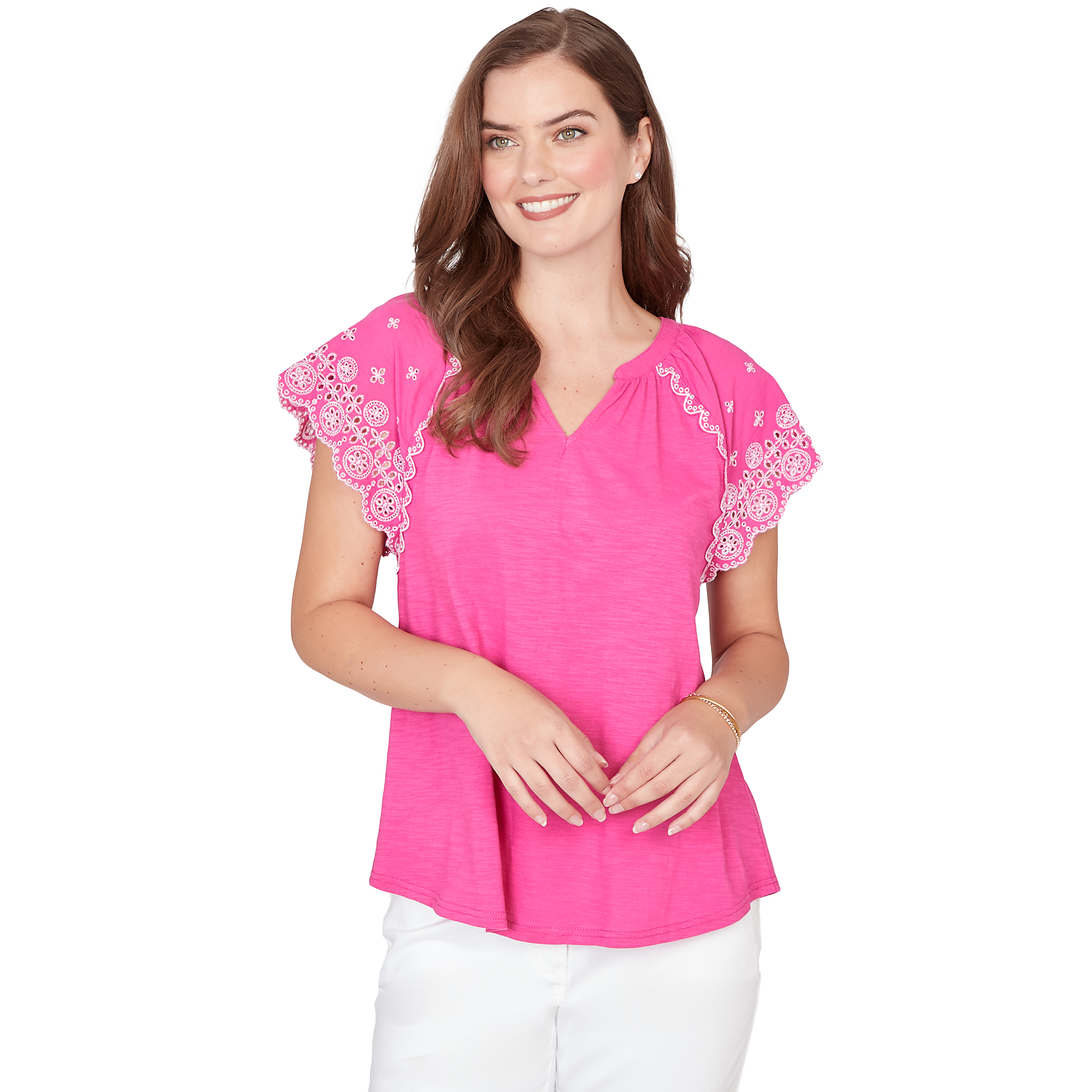 THIS RUBY ROAD WOMEN'S SHORT SLEEVE TOP FEATURES A VIBRANT POP OF COLOR, WITH EYE-CATCHING EMBROIDERY ON THE SLEEVES. PERFECT FOR PAIRING WITH YOUR FAVORITE SHORTS OR CAPRIS.Specifications