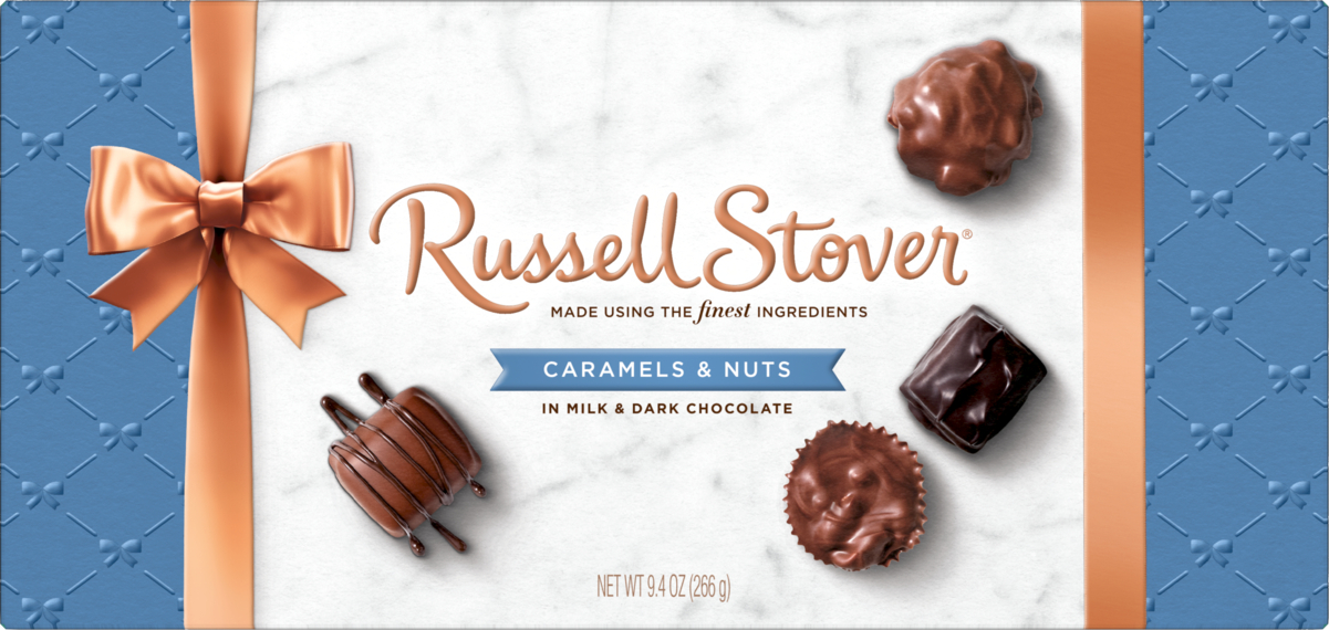 RUSSELL STOVER Caramels & Nuts in Milk Chocolate & Dark Chocolate Gift Box, 9.4 oz, is a assortment of 6 caramel and nut favorites; Milk Chocolate Caramel, Milk Chocolate Pecan Delights, Dark Chocolate Nut Caramel, Milk Chocolate Peanut Cluster, Milk Chocolate Peanut Chew, Milk Chocolate Toffee, Dark Chocolate Almonds, & Milk Chocolate Maple Nut Butter.Specifications