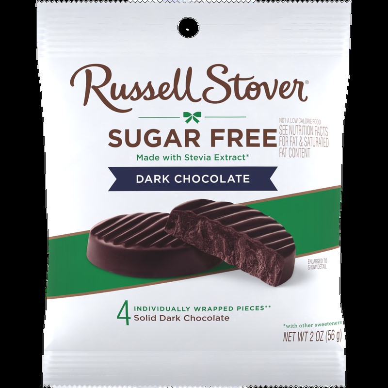 3 OZ; Contains Peanuts, Tree Nuts, Eggs, Wheat; individually wrapped; Russell Stover Sugar Free Dark Chocolate with Stevia Decadent Dark Chocolate, 3 oz. Bag; Sugar Free; This decadent dark chocolate makes a great snack to take on-the-go