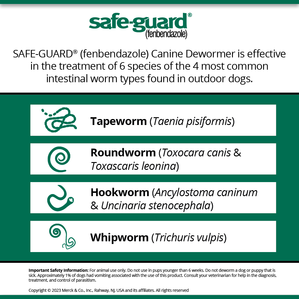 Fenbendazole 22.2% canine dewormer. This product is effective against the four major types of parasites in dogs, including roundworms, hookworms, whipworms and taenia tapeworms. It’s easy to feed just mix the powder into your dog’s food and make sure that your pup eats the full dose. You’ll need to repeat the dose for three days in a row. This deworming medication is considered safe for use in all dogs ages six weeks and older, including pregnant dogs.Specifications