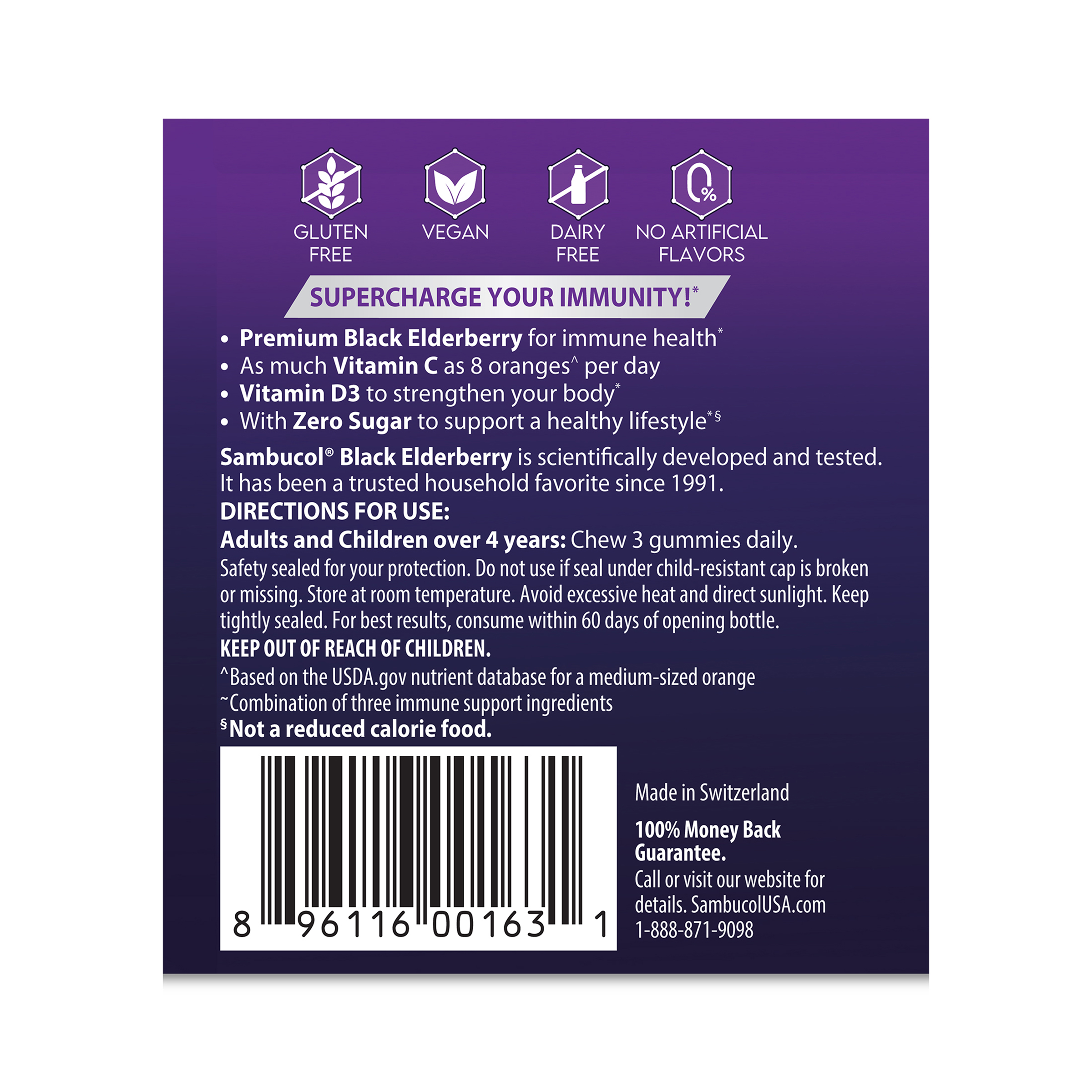 Supercharge your immunity with Sambucol Zero Sugar Triple Immunity Gummies. These delicious gummies are packed with 600 mg Vitamin C and made from premium Haschberg black elderberries (Sambucus nigra) with added Vitamin D. Pectin-based, vegan friendly, and zero sugar per gummy. Made for adults and children ages 4 and up. Sambucol is The Original Elderberry brand, scientifically studied and trusted by millions worldwide.Supercharge your immunity with Sambucol Zero Sugar Triple Immunity GummiesPremium Black Elderberry for immune health As much Vitamin C as 8 oranges per dayVitamin D3 to strengthen your bodyWith Zero Sugar to support a healthy lifestylePectin-based, vegan friendly. Free from artificial flavors. Free from gluten, dairy, eggs, peanuts, nuts, soy, sesame, fish, and shellfishSpecifications