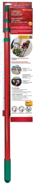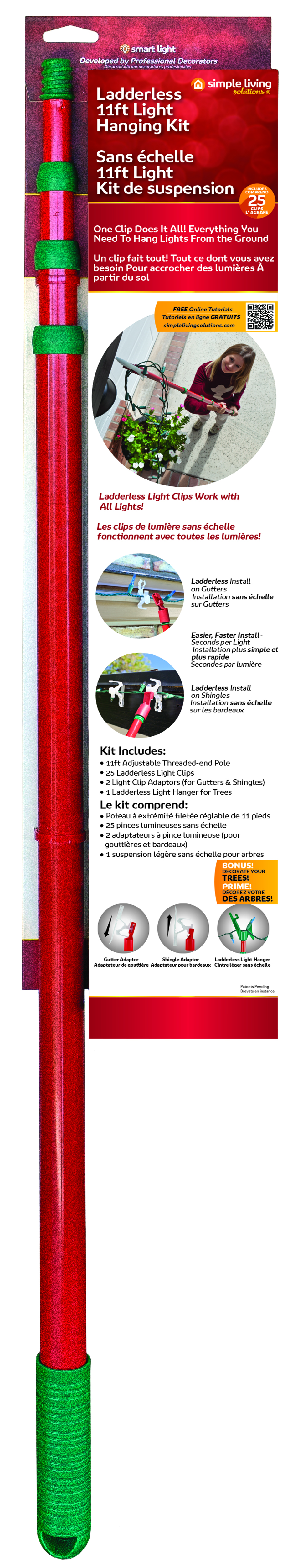 1 LADDERLESS LIGHT HANGER FOR TREES; 11 FT ADJUSTABLE THREADED-END POLE; 2 LIGHT CLIP ADAPTORS (GUTTERS & SHINGLES); 25 LADDERLESS LIGHT HANGER