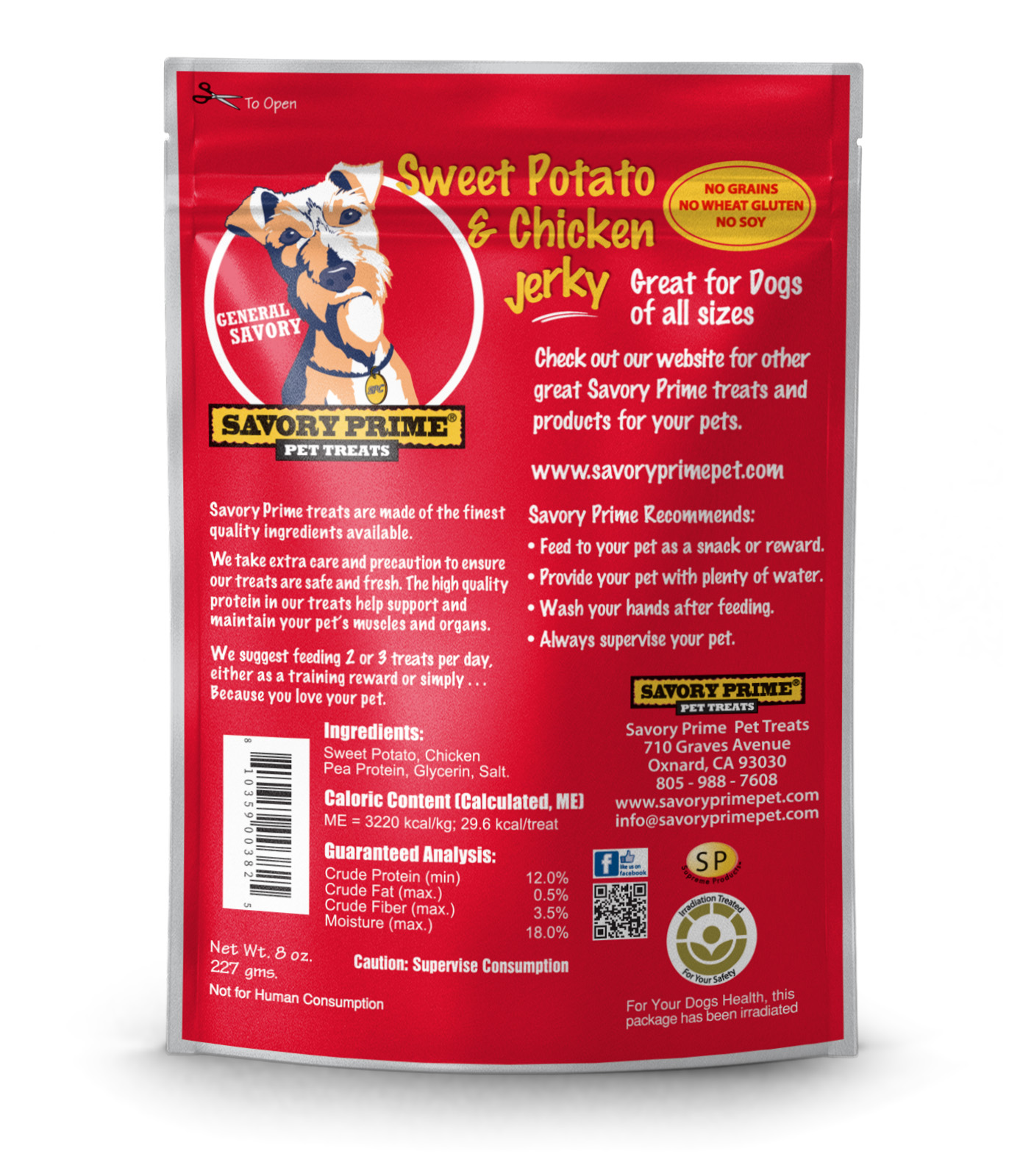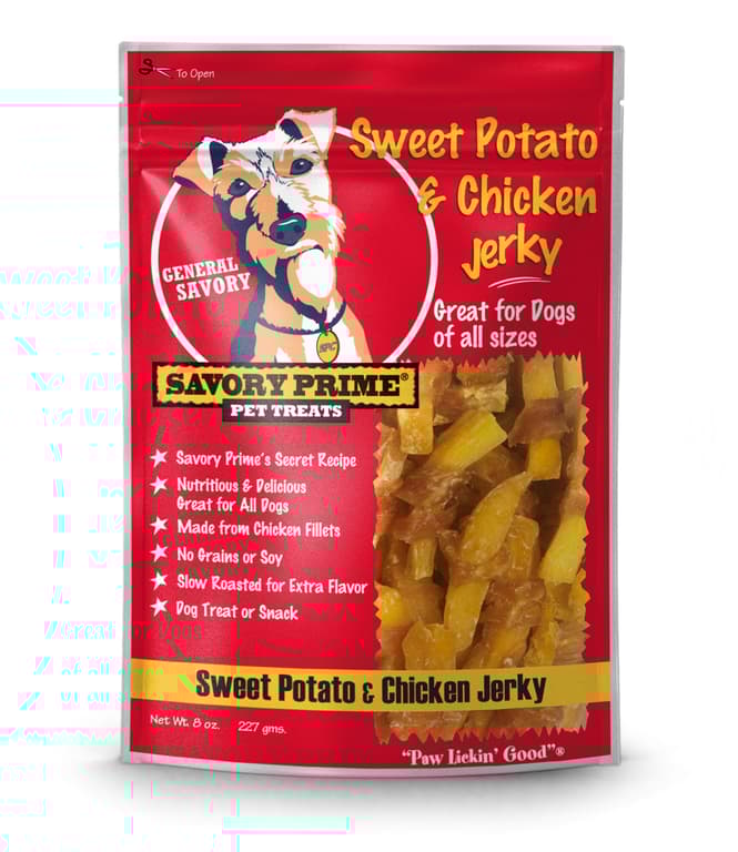 Savory Prime Sweet Potato & Chicken Jerky Wrap Treats satisfy your dog’s craving for real sweet potato and chicken and their natural desire to chew. This limited-ingredient snack is made from 100% farm-raised sweet potatoes and whole-muscle chicken breast, hand sliced for a full-flavored taste and aroma your dog will love. From the ingredients we use to the kitchens where the magic happens, our treats meet strict USDA standards, ensuring a reward you can trust for your loyal companion. Check out our full line of Savory Prime pet treats today!Specifications