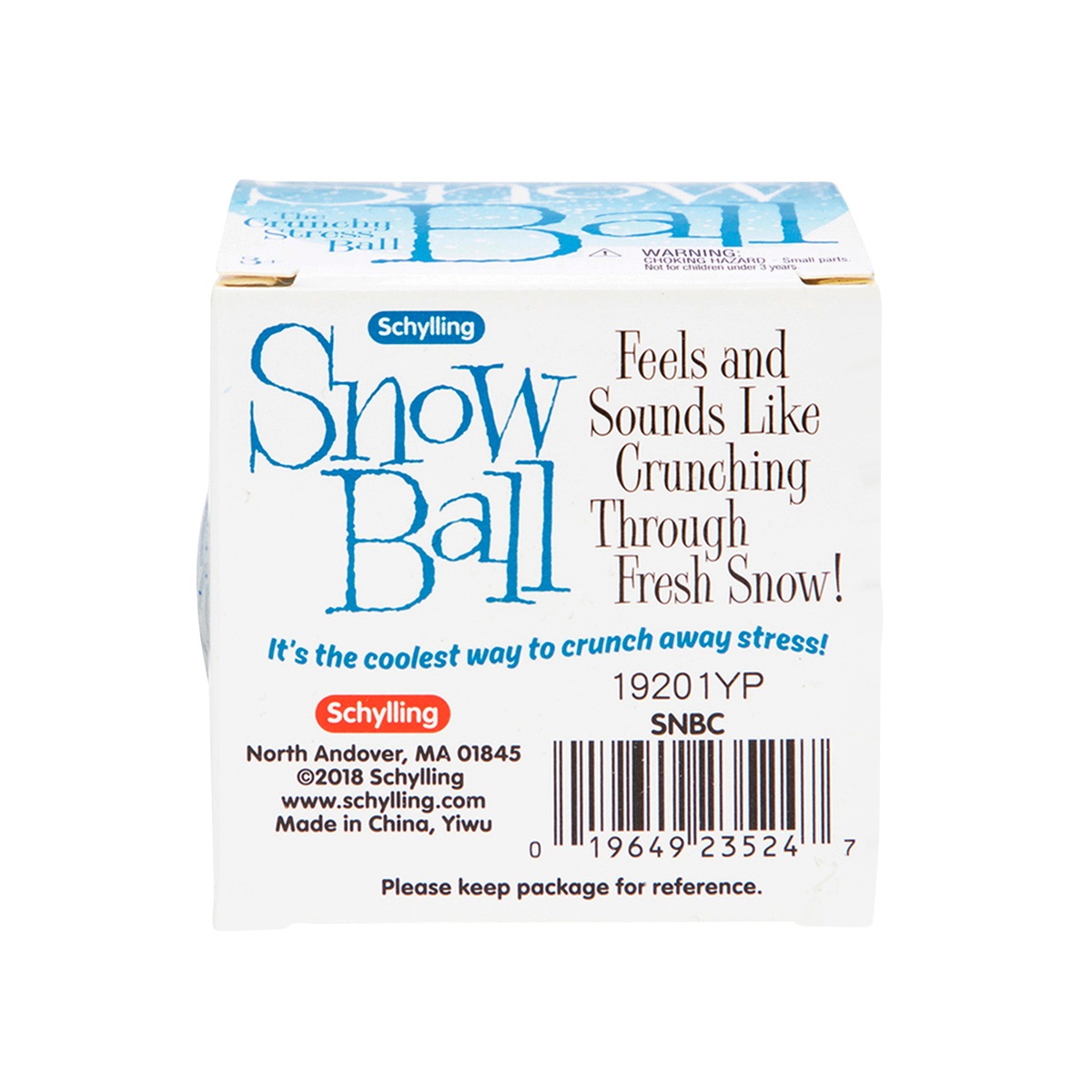 Schylling Snow Ball is designed to look like a real snowball. Crunch & squeeze this squishy white ball with blue dots. Feels like crunching through real snow. This stress ball will give you calm! It is strong, durable and won't break open and always returns to its original shape. It cleans easily with soap and water. Perfect for schools, party favors, the office, stress relief and more! A great fidget toy that helps promote focus. For ages 3 and up. The snowball is 2.5" in diameter.Specifications