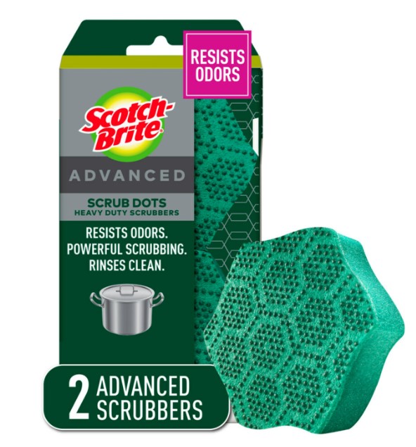 Power through your toughest messes without trapping food. Scotch Brite Advanced Scrub Dots Heavy Duty Scrubbers deliver 3x the scrubbing power, resist odor and rinse clean. The easy to hold hexagonal shape and thick scrubbing pad are designed to work hard and last long. From America's #1 sponge brand.Specifications